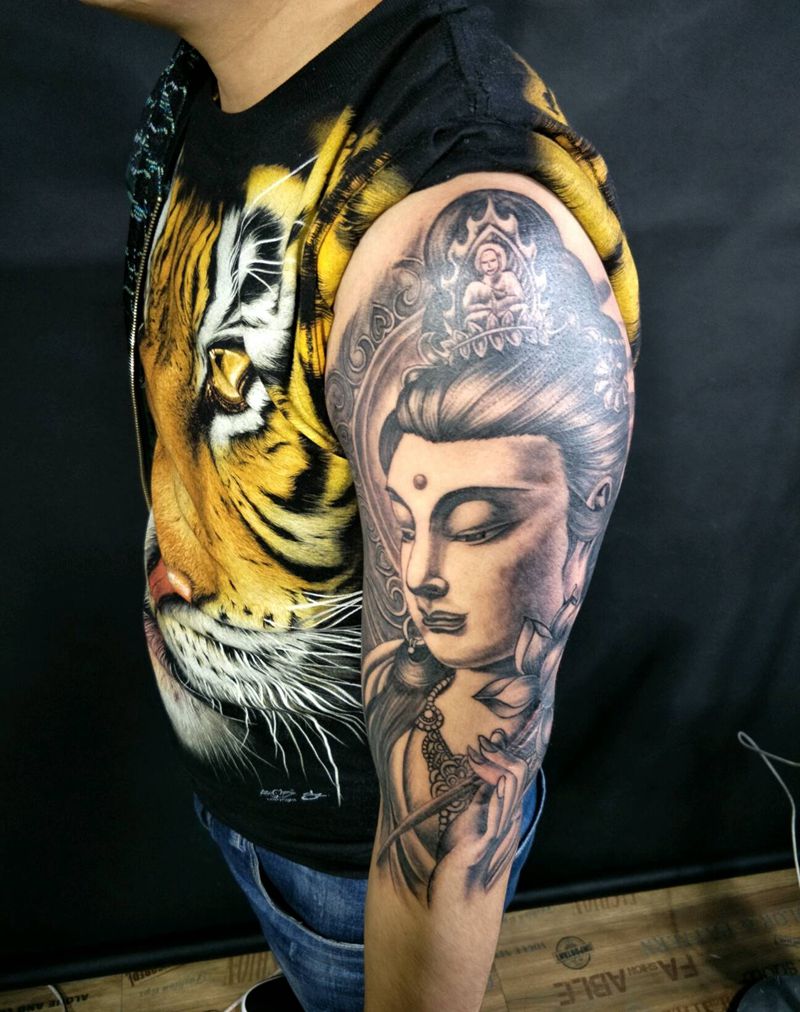 当前位置: 首页 >山西省太原市纹身店-太原翼龙刺青工作室纹身图案>持莲观音纹身图片_手臂传统肖像国画人物鬼神成品手稿纹身图案