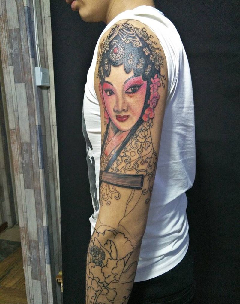 当前位置: 首页 >山西省太原市纹身店-太原翼龙刺青工作室纹身图案>孤芳自赏纹身图片_肩部手臂手部传统人物植物原创成品手稿纹身图案