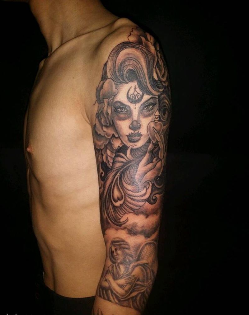 当前位置: 首页 >山西省太原市纹身店-太原翼龙刺青工作室纹身图案>欧美花臂纹身图片_肩部手臂手部欧美写实人物植物静物成品手稿纹身图案