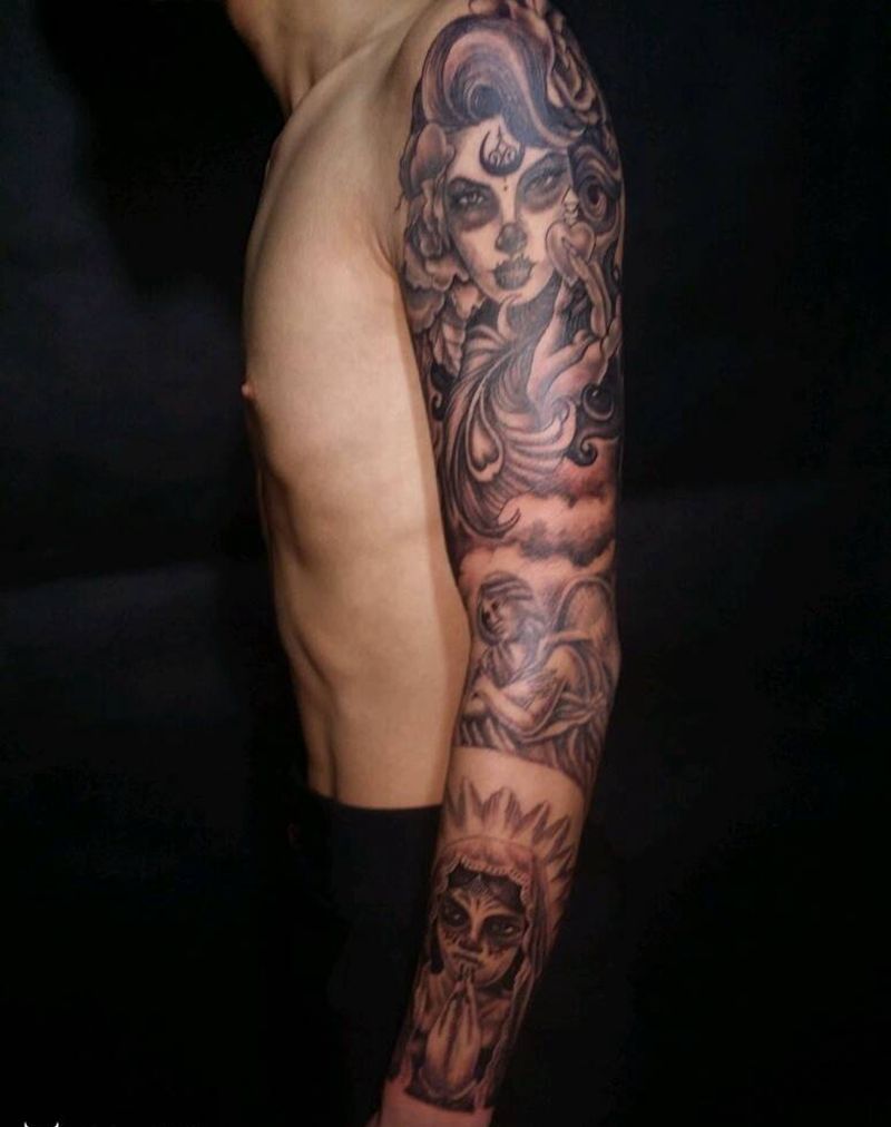 当前位置: 首页 >山西省太原市纹身店-太原翼龙刺青工作室纹身图案>欧美花臂纹身图片_肩部手臂手部欧美写实人物植物静物成品手稿纹身图案
