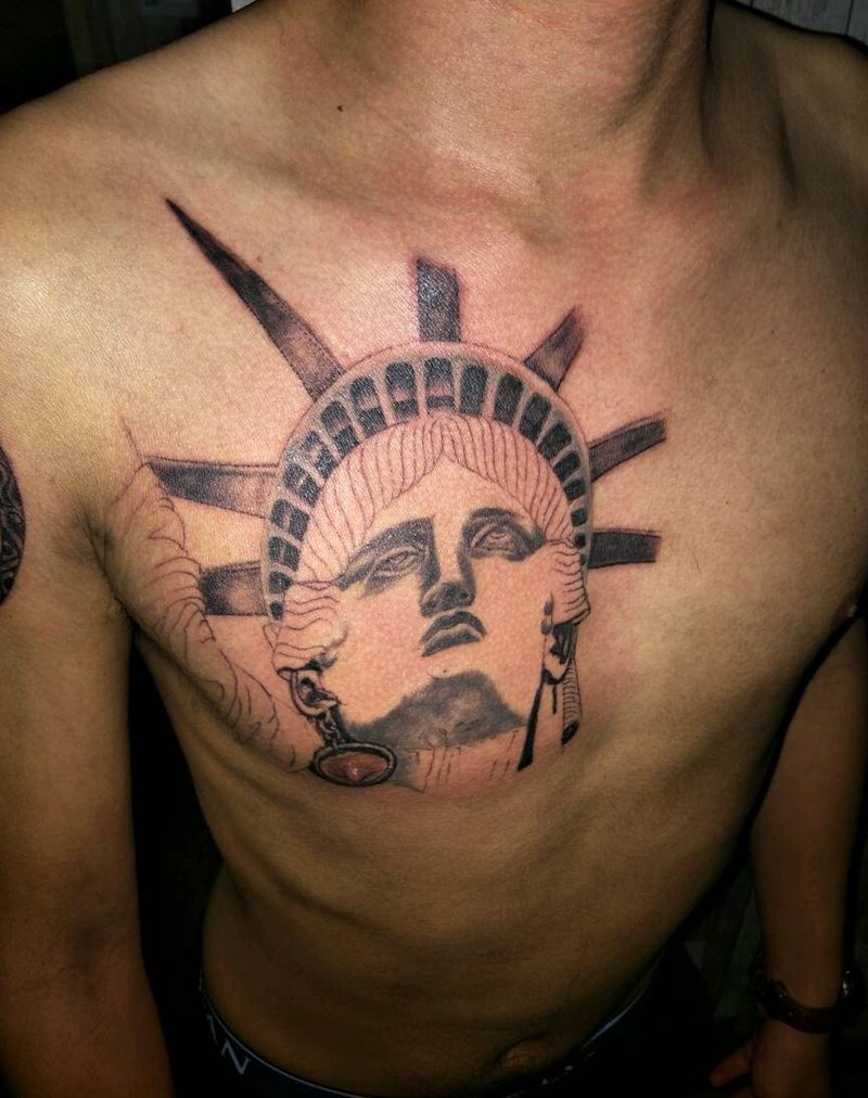 当前位置: 首页 >山西省太原市纹身店-太原翼龙刺青工作室纹身图案>自由女神像纹身图片_肩部胸部手臂欧美传统几何人物成品手稿纹身图案