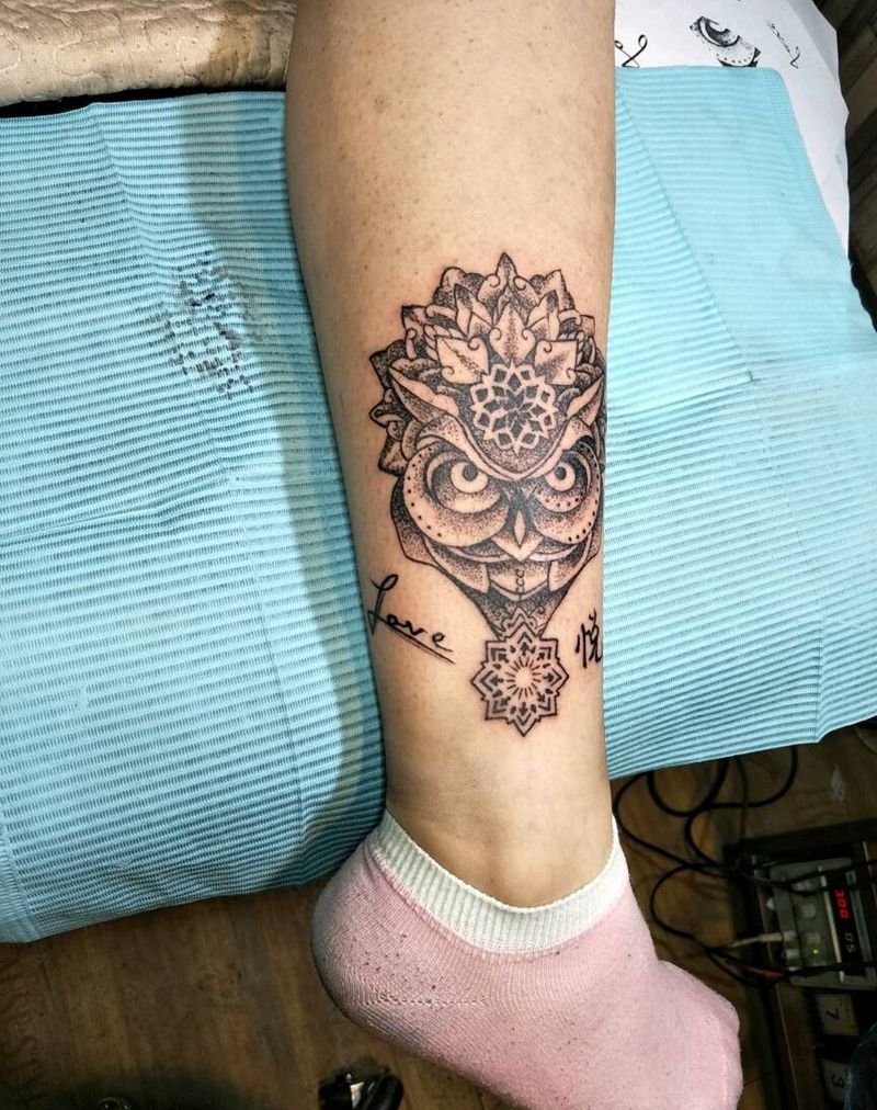 猫头鹰点刺纹身图片_腿部脚部欧美几何动物成品手稿纹身图案