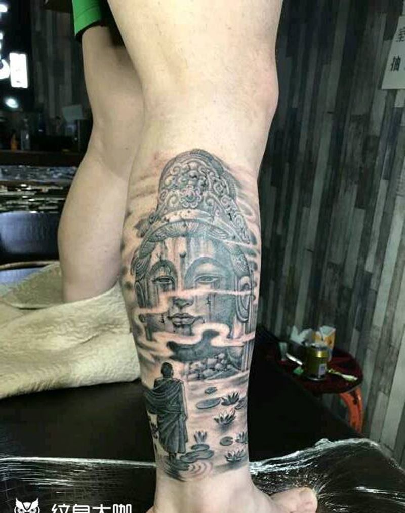 当前位置: 首页 >山西省太原市纹身店-太原翼龙刺青工作室纹身图案>伏虎归来纹身图片_腿部传统人物植物静物鬼神成品手稿纹身图案