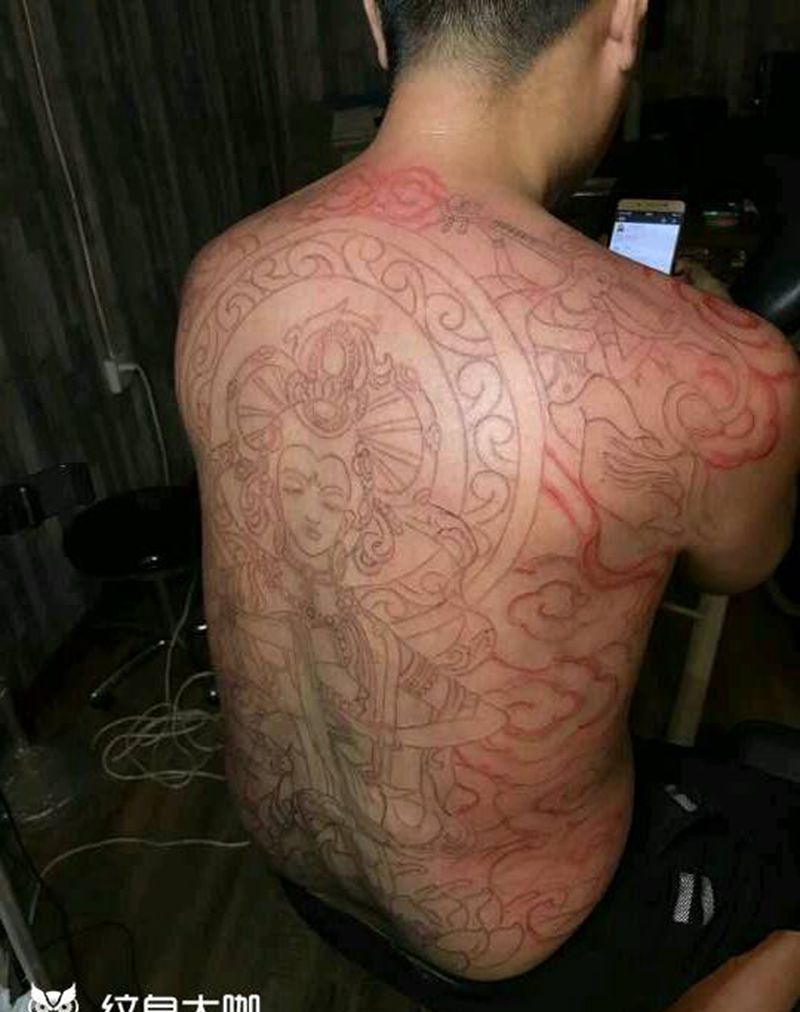 当前位置: 首页 >山西省太原市纹身店-太原翼龙刺青工作室纹身图案>敦煌飞天系列纹身图片_肩部背部传统人物成品手稿纹身图案