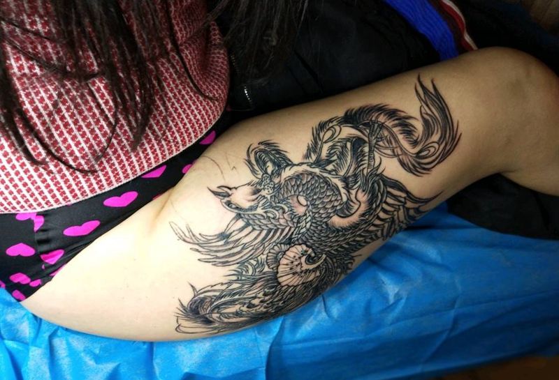 当前位置: 首页 >山西省太原市纹身店-太原翼龙刺青工作室纹身图案>凤凰纹身图片_腿部传统动物成品手稿纹身图案