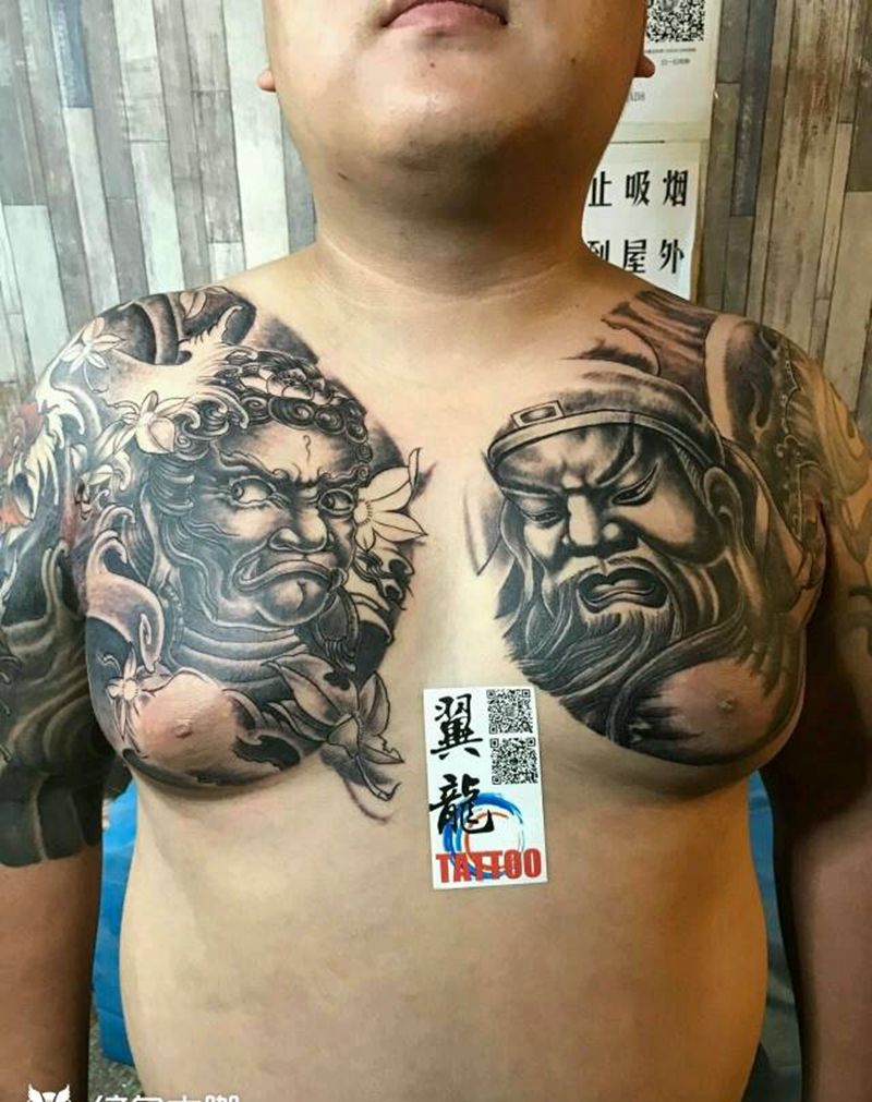 当前位置: 首页 >山西省太原市纹身店-太原翼龙刺青工作室纹身图案>半甲纹身图片_肩部胸部传统人物鬼神成品手稿纹身图案