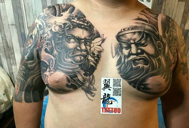 当前位置: 首页 >山西省太原市纹身店-太原翼龙刺青工作室纹身图案>半甲纹身图片_肩部胸部传统人物鬼神成品手稿纹身图案