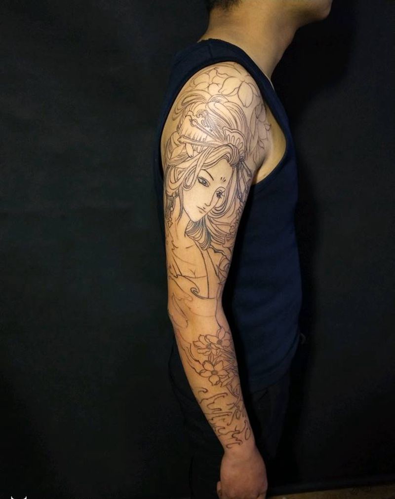 当前位置: 首页 >山西省太原市纹身店-太原翼龙刺青工作室纹身图案>艺妓般若花臂纹身图片_肩部手臂手部传统肖像人物成品手稿纹身图案
