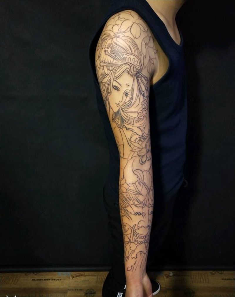 艺妓般若花臂纹身图片_肩部手臂手部传统肖像人物成品手稿纹身图案