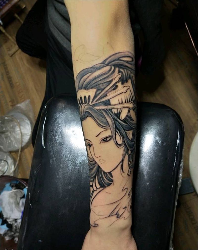 当前位置: 首页 >山西省太原市纹身店-太原翼龙刺青工作室纹身图案>班若艺妓花臂纹身图片_肩部手臂人物鬼神成品手稿插画纹身图案