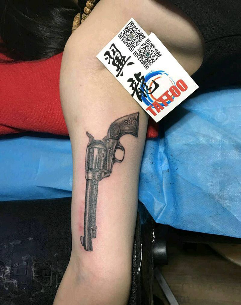 当前位置: 首页 >山西省太原市纹身店-太原翼龙刺青工作室纹身图案>左轮手枪纹身图片_手臂传统静物成品手稿纹身图案