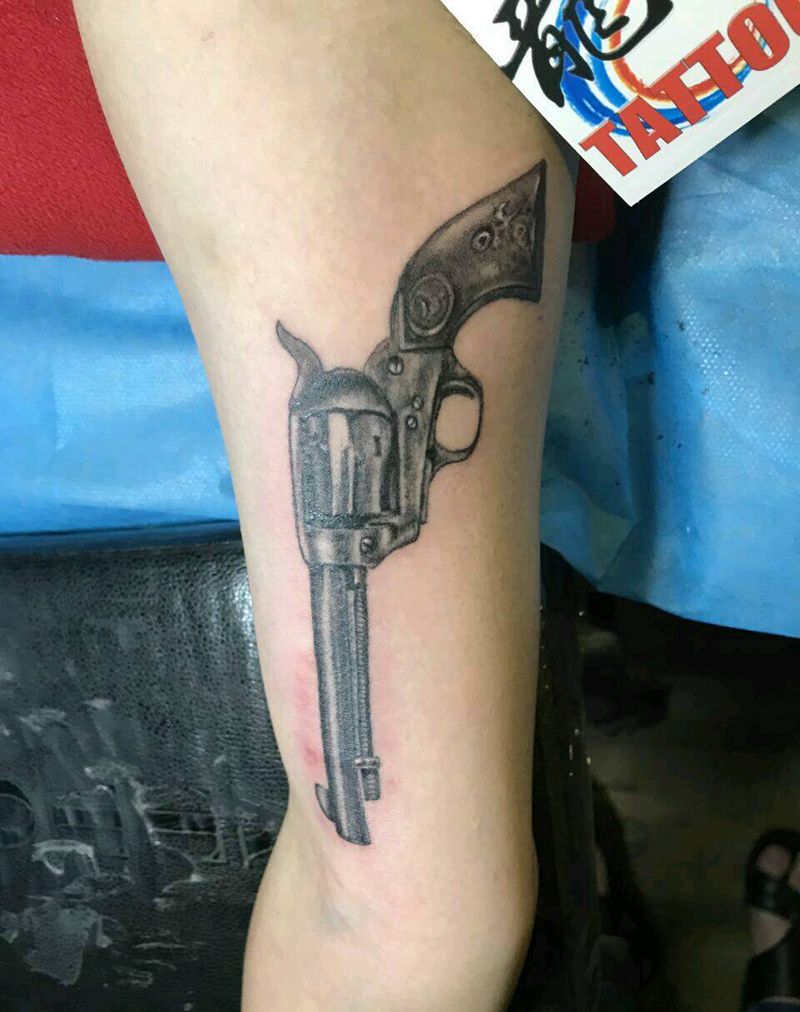 当前位置: 首页 >山西省太原市纹身店-太原翼龙刺青工作室纹身图案>左轮手枪纹身图片_手臂传统静物成品手稿纹身图案