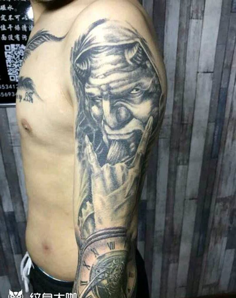 当前位置: 首页 >山西省太原市纹身店-太原翼龙刺青工作室纹身图案>撒旦与教堂欧美花臂纹身图片_手臂欧美传统人物静物成品手稿纹身图案