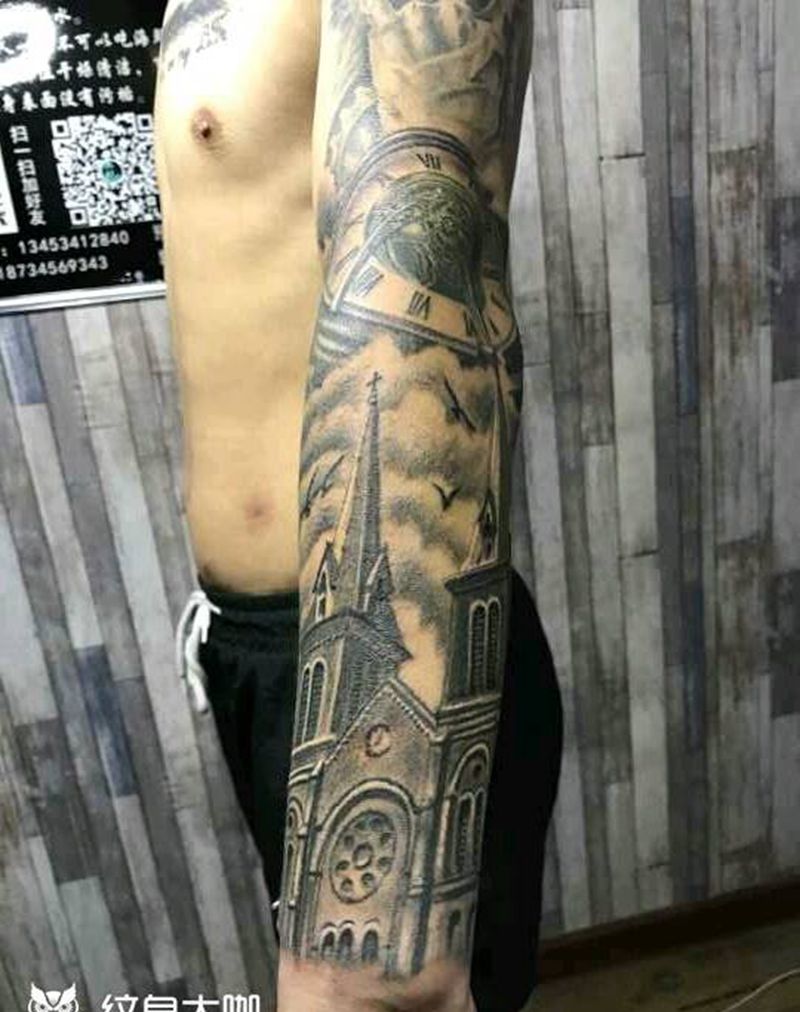 撒旦与教堂欧美花臂纹身图片_手臂欧美传统人物静物成品手稿纹身图案