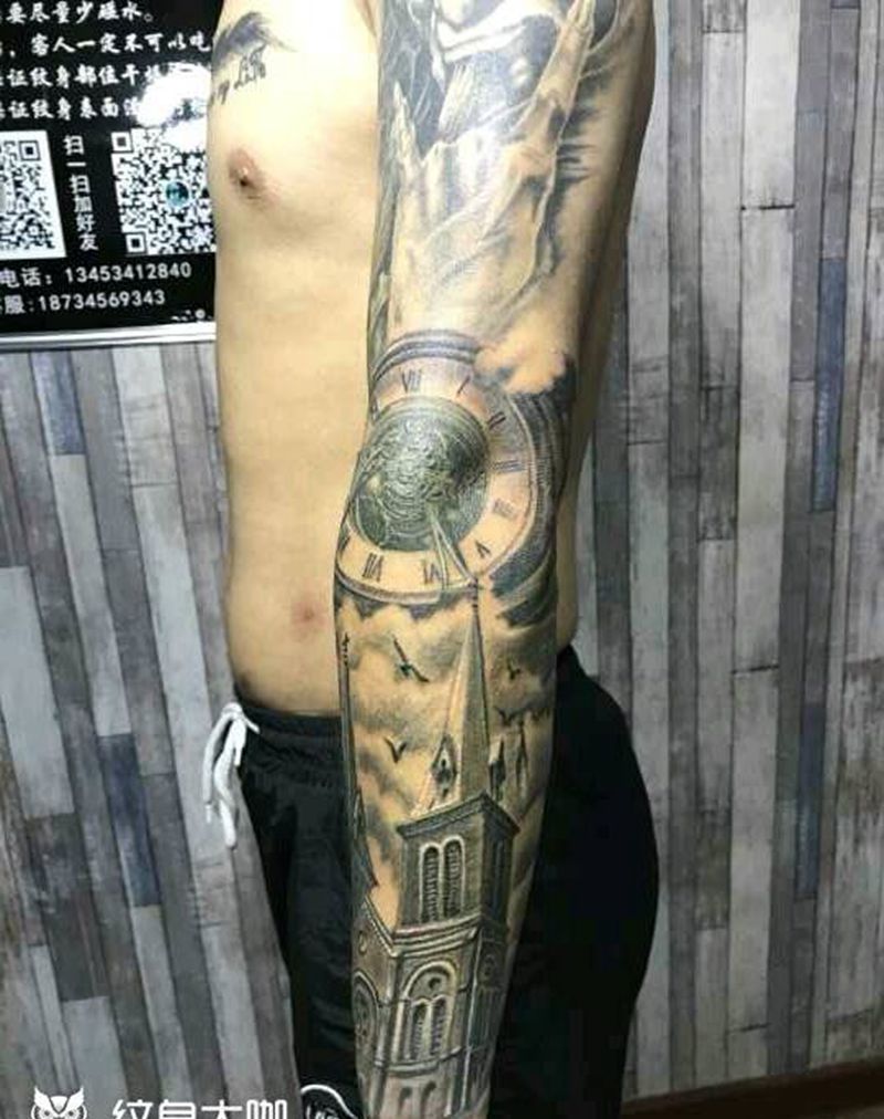 当前位置: 首页 >山西省太原市纹身店-太原翼龙刺青工作室纹身图案>撒旦与教堂欧美花臂纹身图片_手臂欧美传统人物静物成品手稿纹身图案