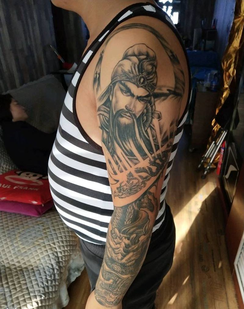 当前位置: 首页 >山西省太原市纹身店-太原翼龙刺青工作室纹身图案>关公盘龙纹身图片_肩部手臂动物人物静物成品手稿纹身图案