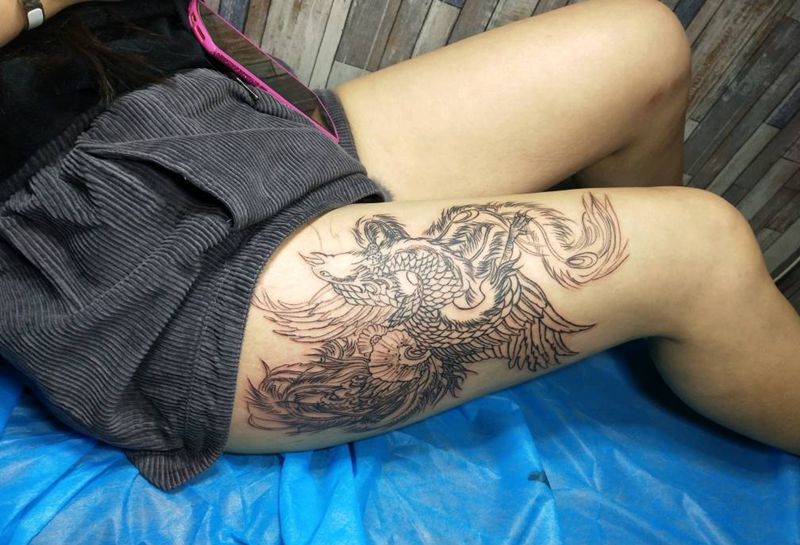 当前位置: 首页 >山西省太原市纹身店-太原翼龙刺青工作室纹身图案>凤凰纹身图片_腿部传统动物手稿纹身图案