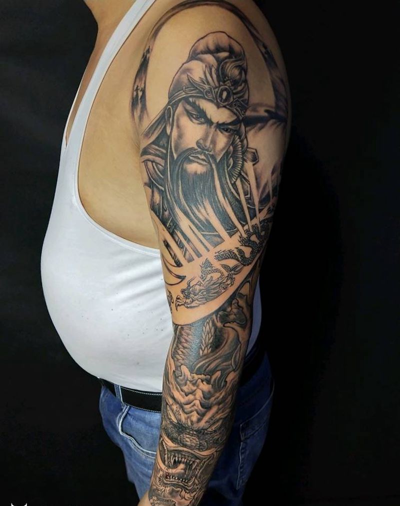 当前位置: 首页 >山西省太原市纹身店-太原翼龙刺青工作室纹身图案>关公祥龙护长城纹身图片_肩部手臂传统肖像成品手稿纹身图案