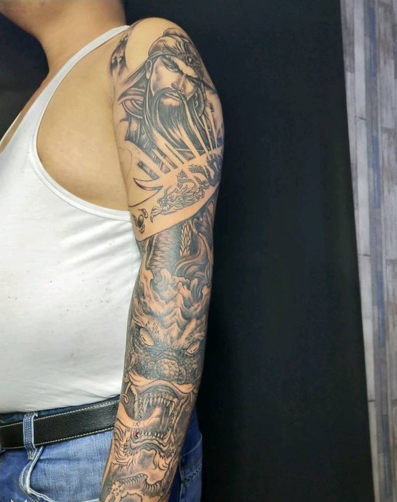 当前位置: 首页 >山西省太原市纹身店-太原翼龙刺青工作室纹身图案>关公祥龙护长城纹身图片_肩部手臂传统肖像成品手稿纹身图案