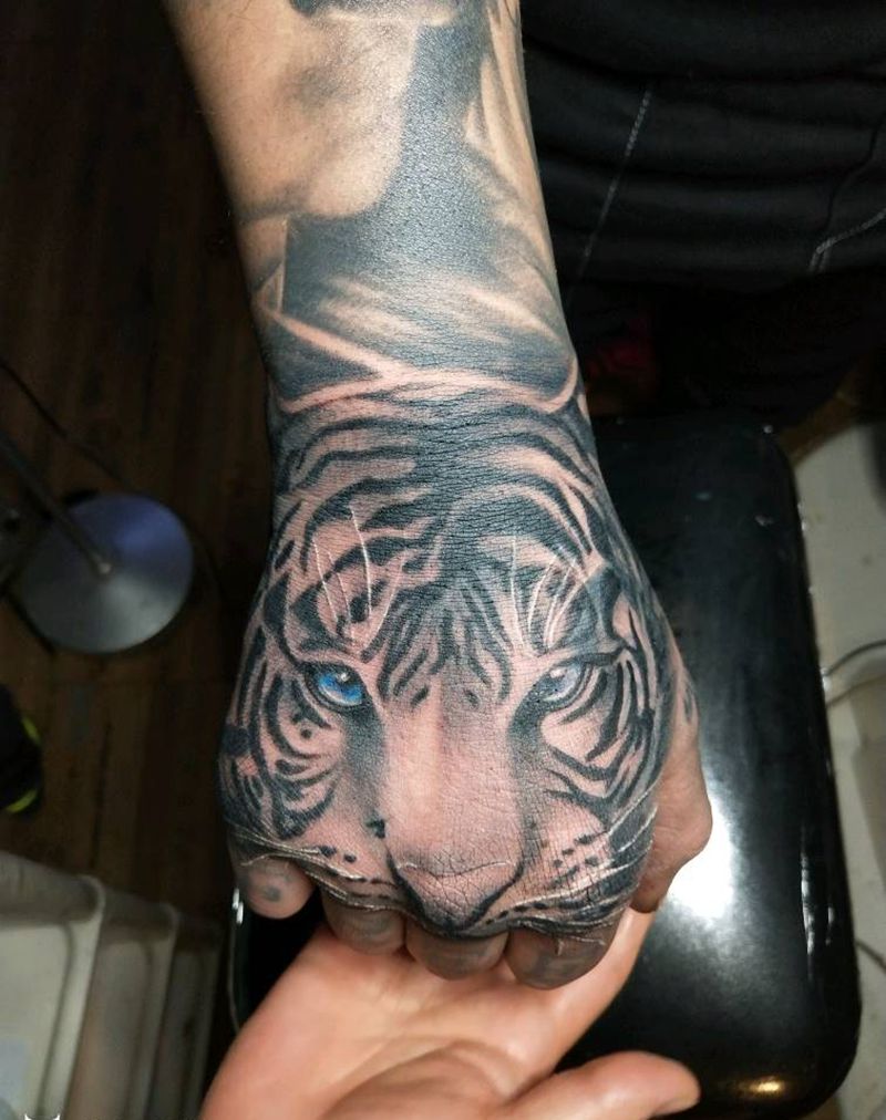 当前位置: 首页 >山西省太原市纹身店-太原翼龙刺青工作室纹身图案>虎头纹身图片_手臂手部传统动物成品手稿纹身图案