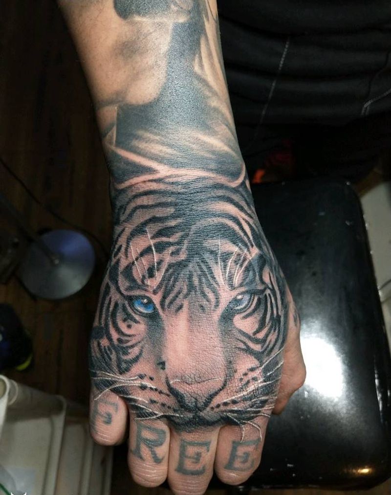 当前位置: 首页 >山西省太原市纹身店-太原翼龙刺青工作室纹身图案>虎头纹身图片_手臂手部传统动物成品手稿纹身图案