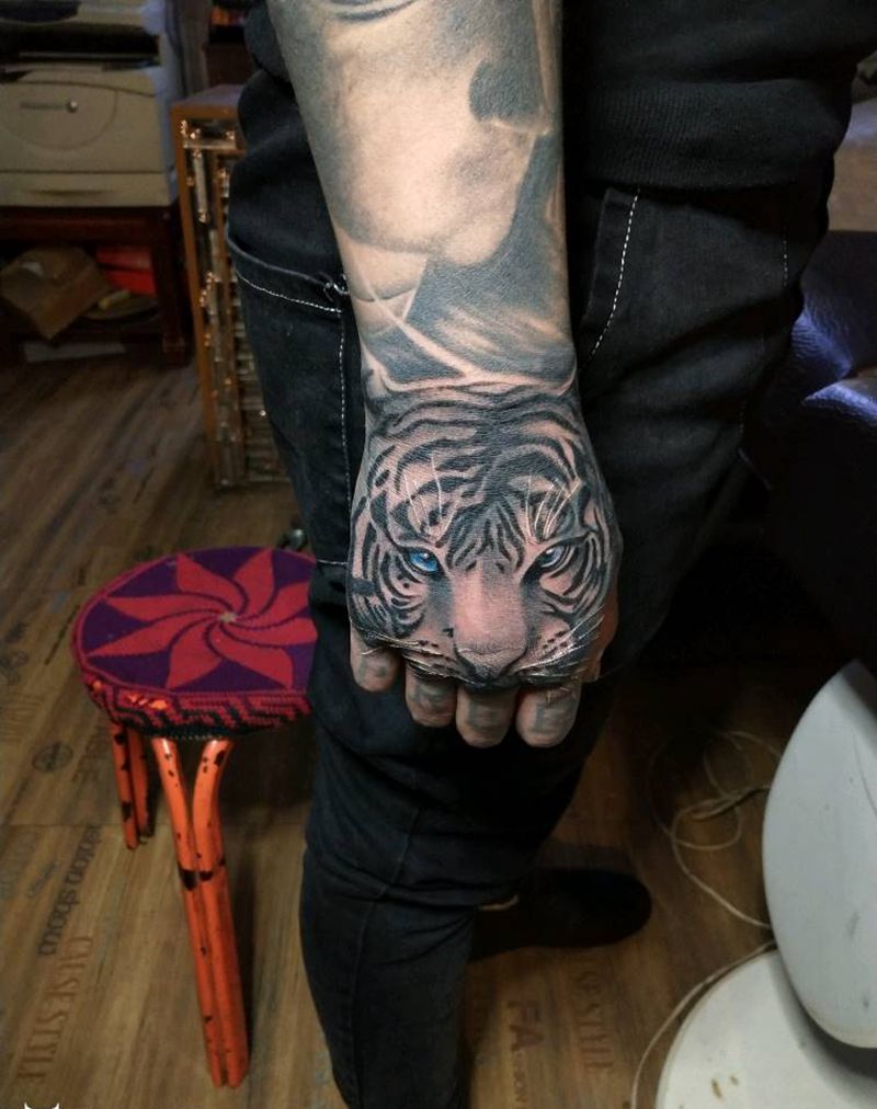 当前位置: 首页 >山西省太原市纹身店-太原翼龙刺青工作室纹身图案>虎头纹身图片_手臂手部传统动物成品手稿纹身图案