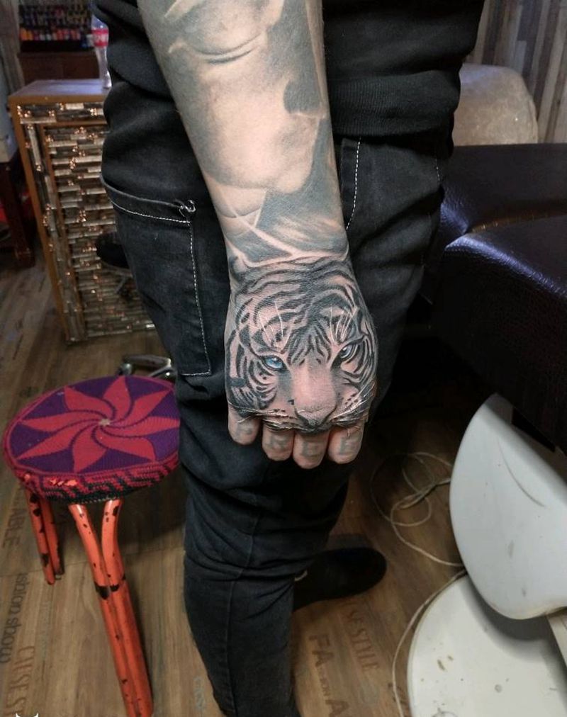 当前位置: 首页 >山西省太原市纹身店-太原翼龙刺青工作室纹身图案>虎头纹身图片_手臂手部传统动物成品手稿纹身图案