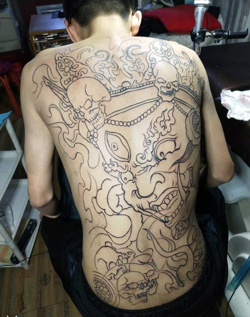 当前位置: 首页 >山西省太原市纹身店-太原翼龙刺青工作室纹身图案>大黑天纹身图片_背部传统鬼神手稿纹身图案