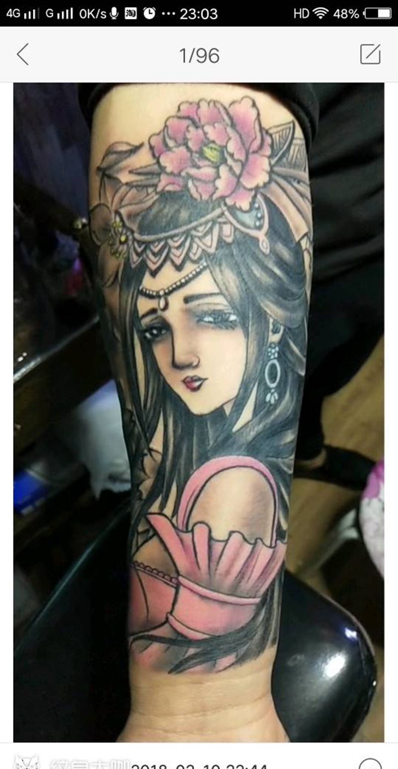 当前位置: 首页 >山西省太原市纹身店-太原翼龙刺青工作室纹身图案>艺妓纹身图片_手臂手部传统国画人物成品手稿纹身图案