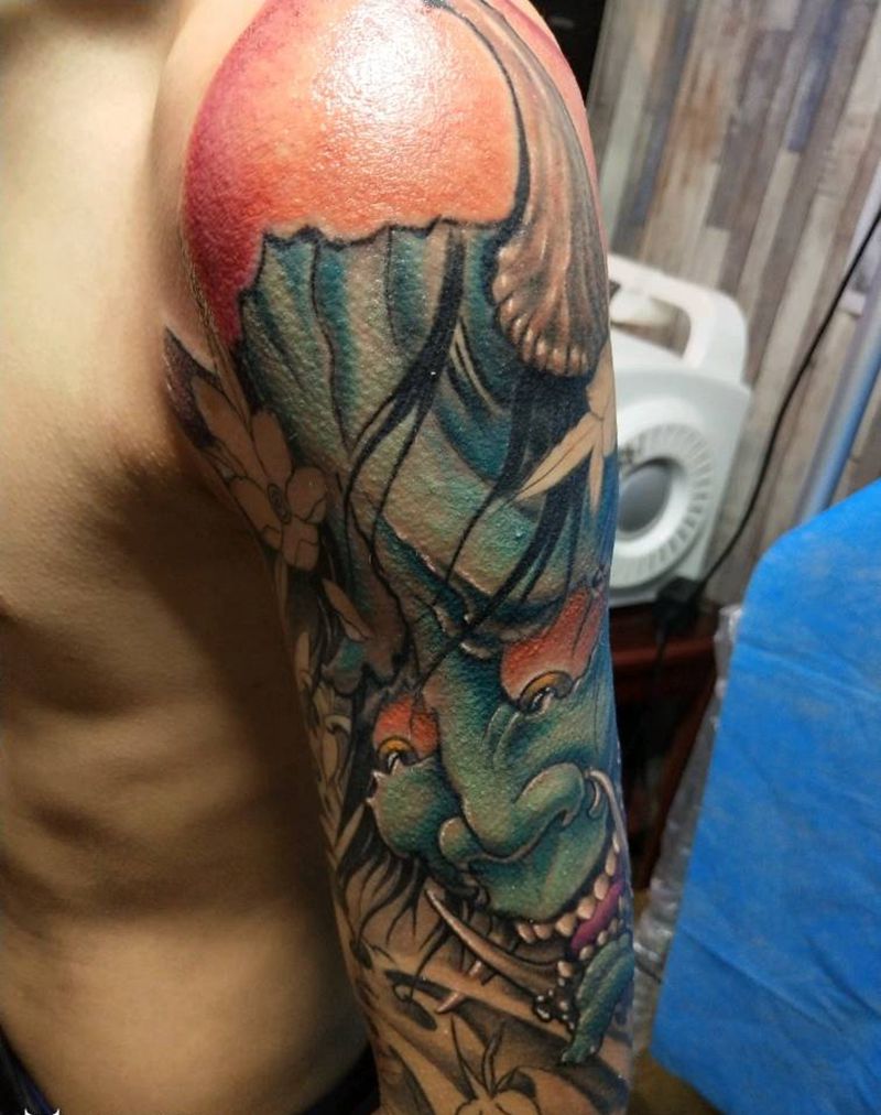 当前位置: 首页 >山西省太原市纹身店-太原翼龙刺青工作室纹身图案>班若妖姬花臂纹身图片_手臂传统人物鬼神成品手稿插画纹身图案