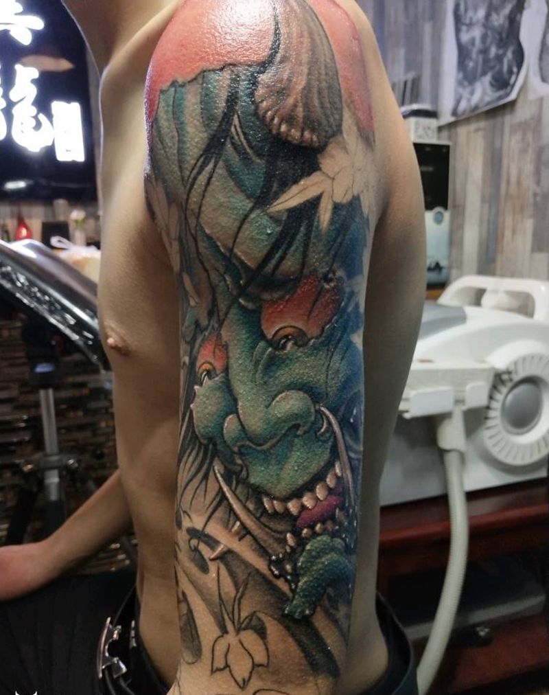 当前位置: 首页 >山西省太原市纹身店-太原翼龙刺青工作室纹身图案>班若妖姬花臂纹身图片_手臂传统人物鬼神成品手稿插画纹身图案