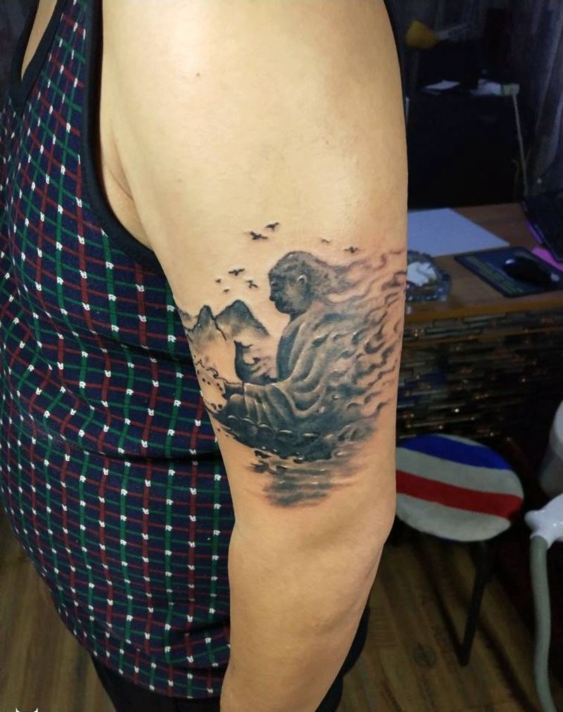 当前位置: 首页 >山西省太原市纹身店-太原翼龙刺青工作室纹身图案>阿弥陀福纹身图片_手臂传统人物鬼神宗教成品手稿纹身图案