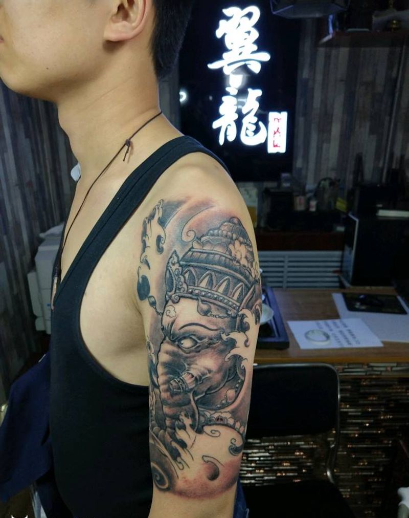 当前位置: 首页 >山西省太原市纹身店-太原翼龙刺青工作室纹身图案>象神纹身图片_手臂动物鬼神成品手稿纹身图案