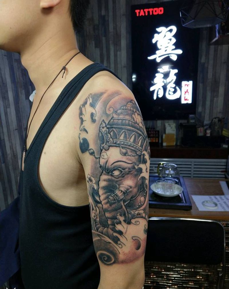 当前位置: 首页 >山西省太原市纹身店-太原翼龙刺青工作室纹身图案>象神纹身图片_手臂动物鬼神成品手稿纹身图案