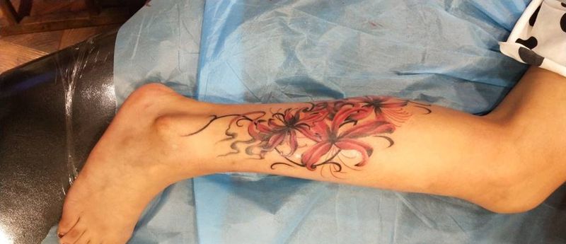 当前位置: 首页 >山西省太原市纹身店-太原翼龙刺青工作室纹身图案>彼岸花,纹身图片_腿部脚部传统植物成品手稿纹身图案