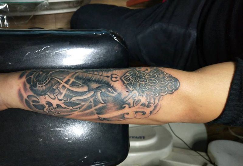 当前位置: 首页 >山西省太原市纹身店-太原翼龙刺青工作室纹身图案>象神纹身图片_手臂传统动物鬼神成品手稿纹身图案