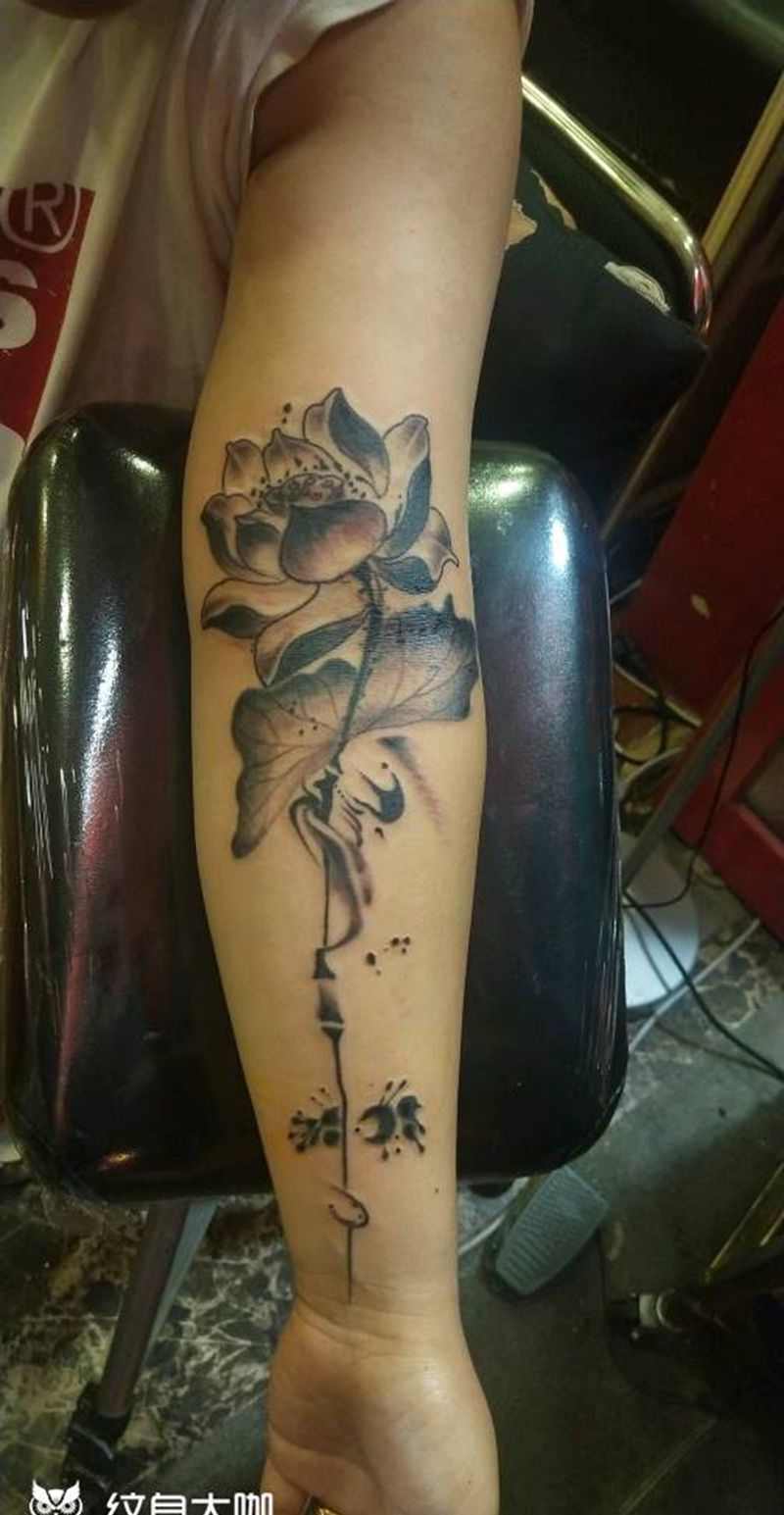 当前位置: 首页 >山西省太原市纹身店-太原翼龙刺青工作室纹身图案>水墨荷花纹身图片_手臂植物成品手稿纹身图案