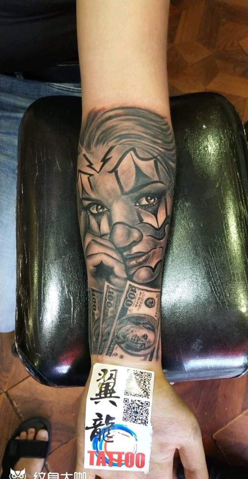 当前位置: 首页 >山西省太原市纹身店-太原翼龙刺青工作室纹身图案>小丑女纹身图片_手臂欧美写实纹身图案