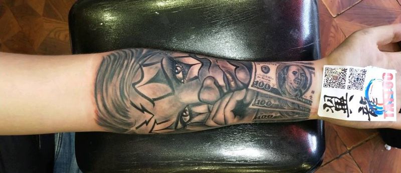 当前位置: 首页 >山西省太原市纹身店-太原翼龙刺青工作室纹身图案>小丑女纹身图片_手臂欧美写实纹身图案