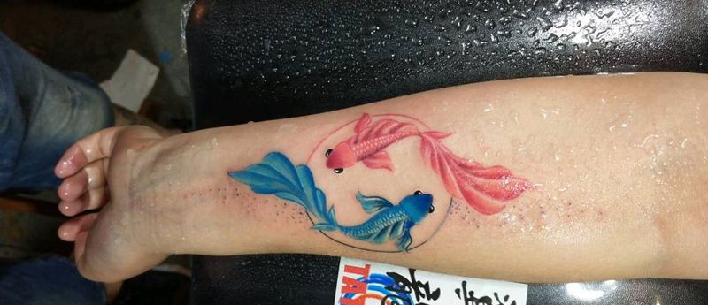 当前位置: 首页 >山西省太原市纹身店-太原翼龙刺青工作室纹身图案>双鱼纹身图片_手臂传统动物成品手稿插画纹身图案