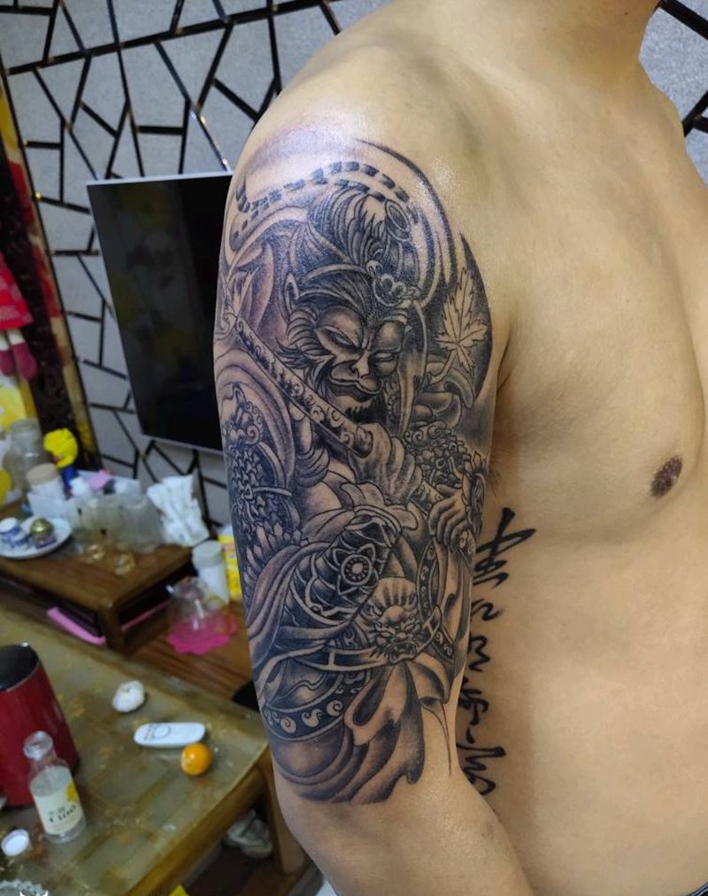 当前位置: 首页 >山西省太原市纹身店-太原翼龙刺青工作室纹身图案>孙悟空送手稿纹身图片_肩部手臂老传统纹身图案