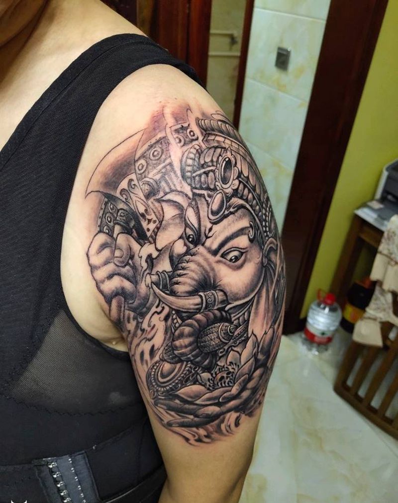 当前位置: 首页 >山西省太原市纹身店-太原翼龙刺青工作室纹身图案>象神纹身图片_手臂肩部老传统纹身图案