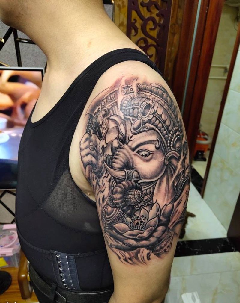 当前位置: 首页 >山西省太原市纹身店-太原翼龙刺青工作室纹身图案>象神纹身图片_手臂肩部老传统纹身图案