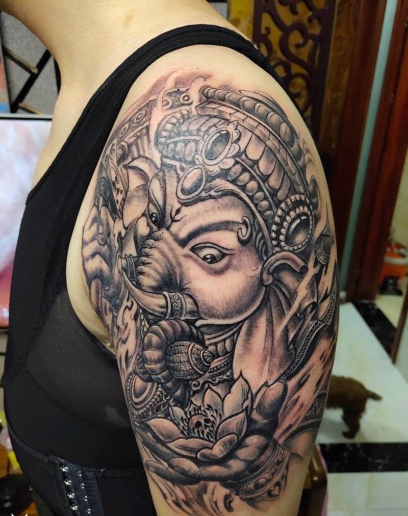 当前位置: 首页 >山西省太原市纹身店-太原翼龙刺青工作室纹身图案>象神纹身图片_手臂肩部老传统纹身图案