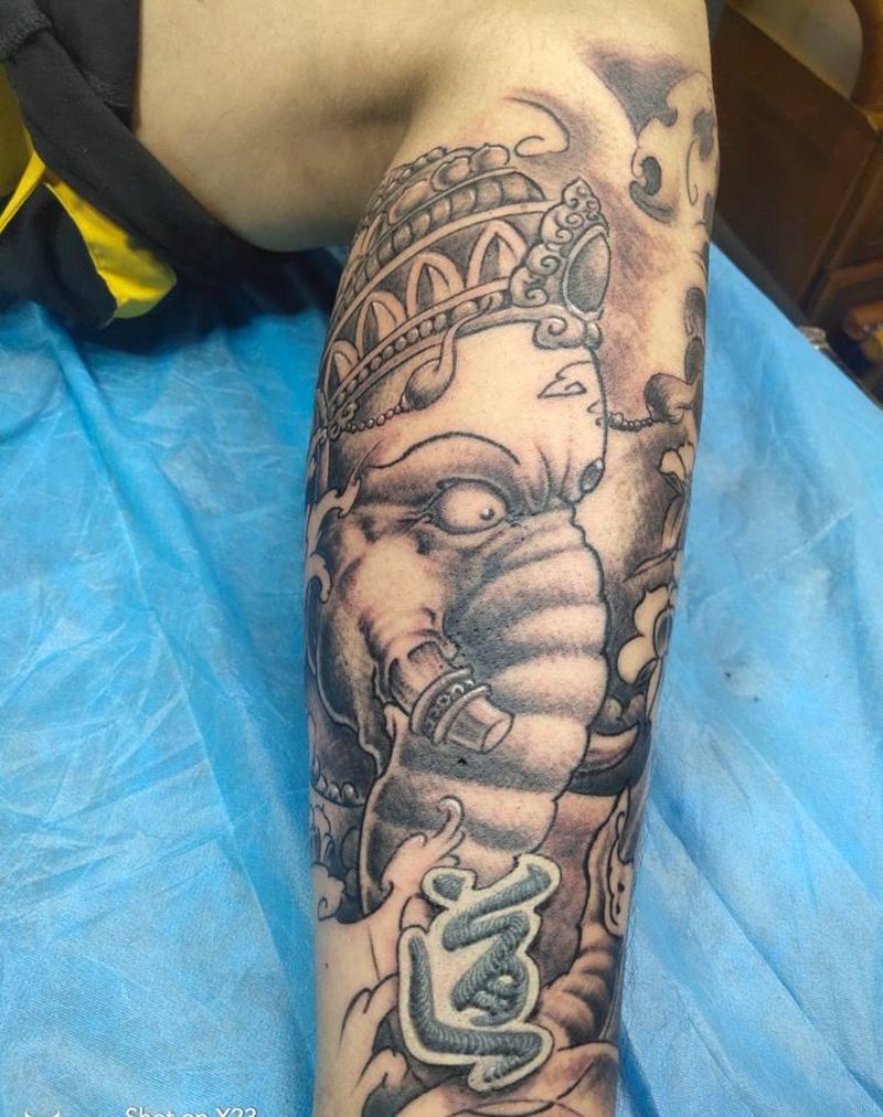 当前位置: 首页 >山西省太原市纹身店-太原翼龙刺青工作室纹身图案>象神纹身图片_腿部新传统纹身图案