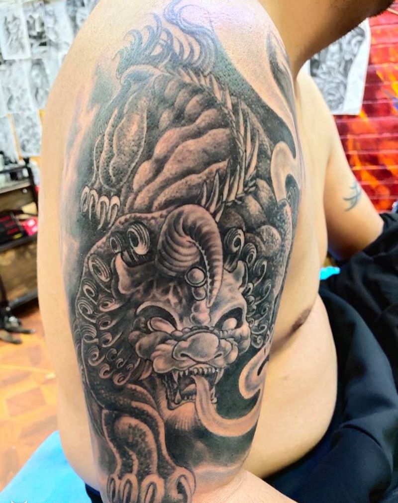 当前位置: 首页 >山西省太原市纹身店-太原翼龙刺青工作室纹身图案>貔貅纹身图片_肩部手臂新传统欧美写实纹身图案