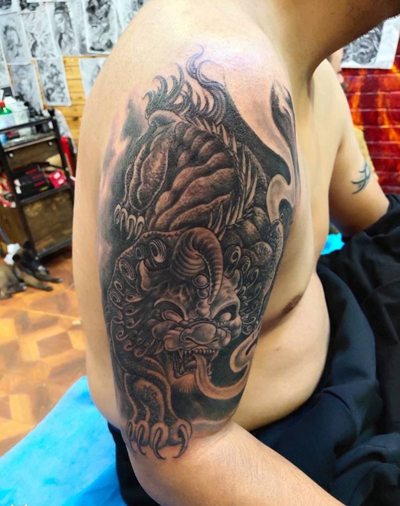 当前位置: 首页 >山西省太原市纹身店-太原翼龙刺青工作室纹身图案>貔貅纹身图片_肩部手臂新传统欧美写实纹身图案