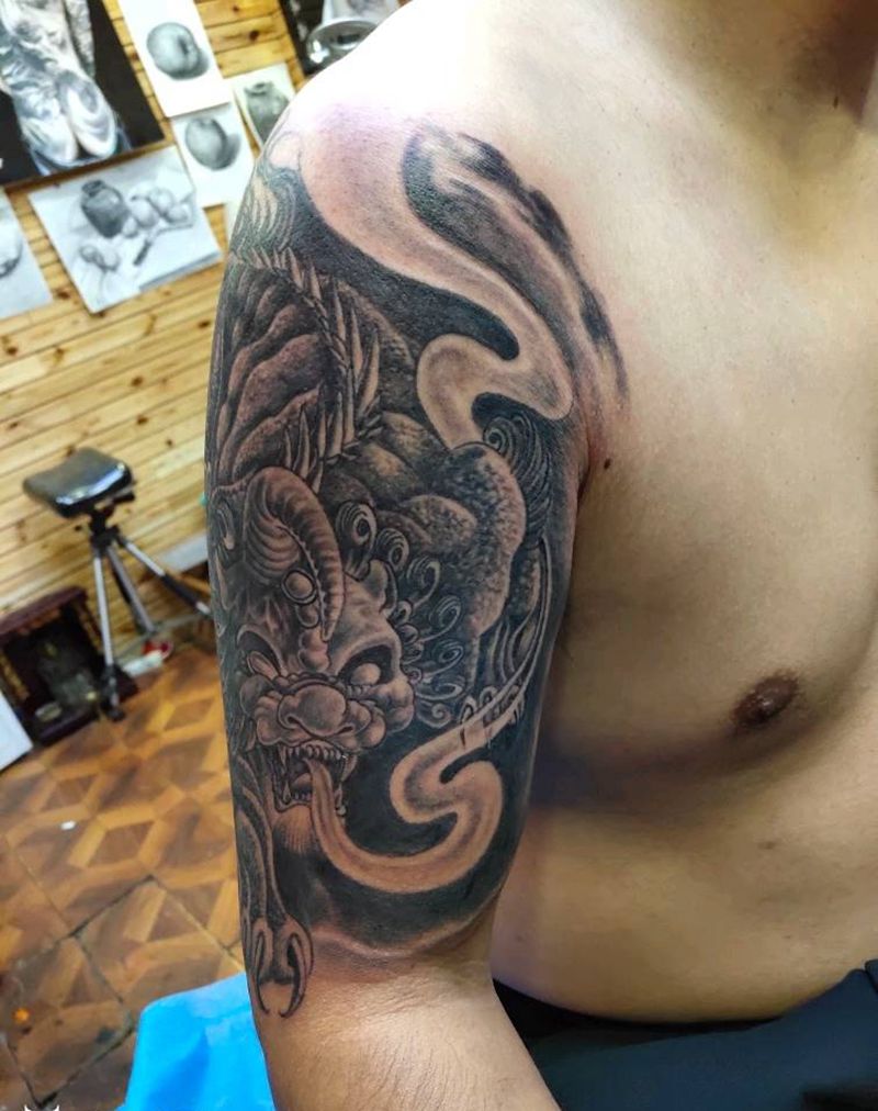 当前位置: 首页 >山西省太原市纹身店-太原翼龙刺青工作室纹身图案>貔貅纹身图片_肩部手臂新传统欧美写实纹身图案