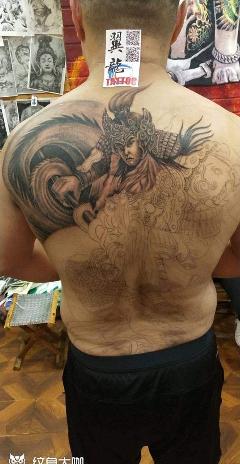 当前位置: 首页 >山西省太原市纹身店-太原翼龙刺青工作室纹身图案>赵云纹身图片_背部传统肖像动物人物成品手稿插画纹身图案