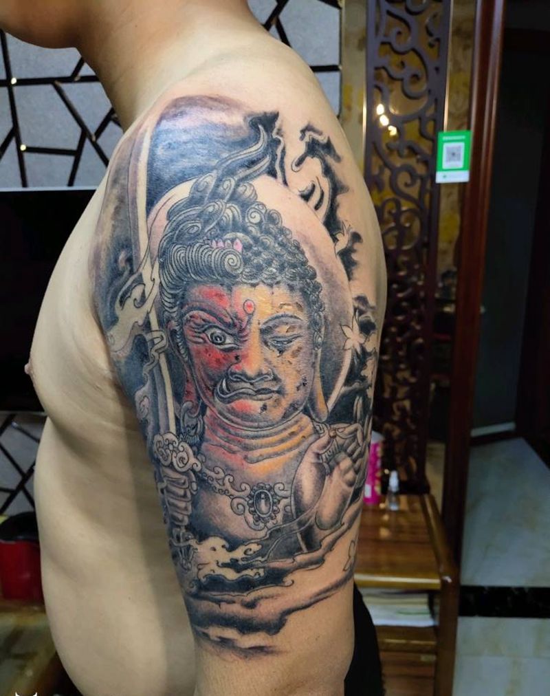 当前位置: 首页 >山西省太原市纹身店-太原翼龙刺青工作室纹身图案>不动明王纹身图片_手臂肩部老传统纹身图案